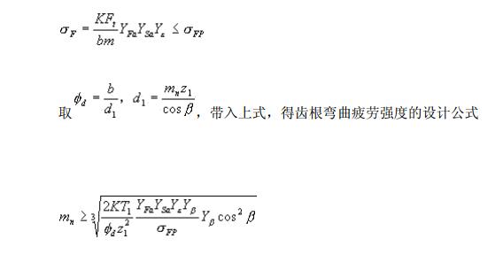 中空旋轉平臺減速機的斜齒輪的齒根彎曲疲勞強度計算,通常按其法面當量齒輪進行,各參數均為法面參數。由于斜齒輪的接觸線是傾斜的,輪齒多為局部折斷,其承載能力比直齒輪顯著增加。因此,螺旋角對齒根彎曲強度產生的有利影響,用螺旋角系數 Yb予以考慮。則齒根彎曲疲勞強度的校核公式為上圖所示……