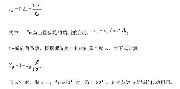 式中 YFa-齒形系數,按當量齒數 ,由圖外齒輪的齒形系數 YFa查取; YSa-應力修正系數,按當量齒數 ,由圖應力修正系數 YSa查取; Ye-重合度系數,根據端面重合度系數 和軸向重合度 ,由上式計算 ……