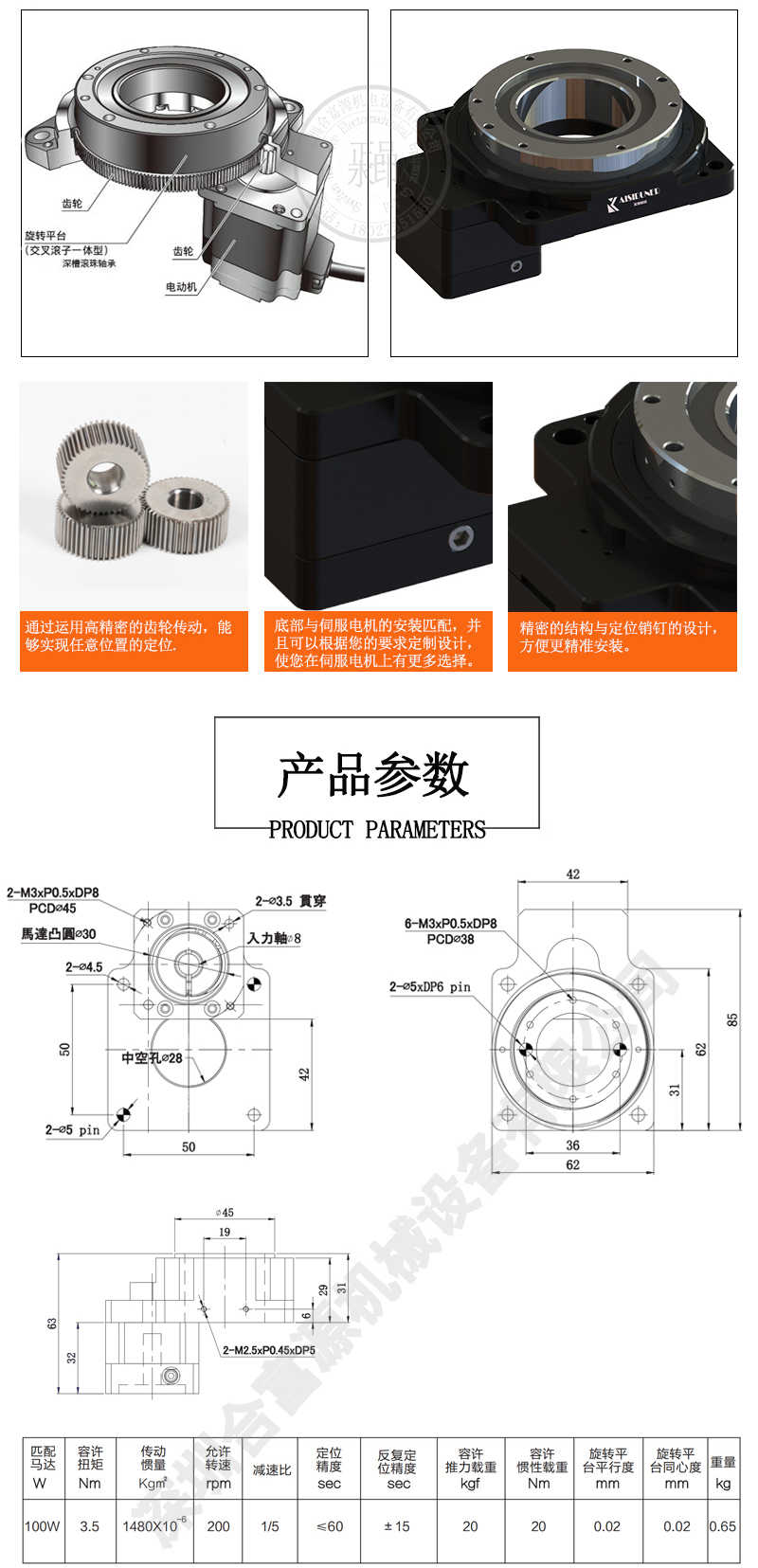• 角度旋轉定位精準,精度0.5弧分。如:盤面1000mm旋轉一圈誤差0.02mm 外殼鋁料,采用加工中心一次裝夾成形,加工精度高,幾何誤差小。同心度高 傳動齒輪材料20CrMnTiH鍛造成形。